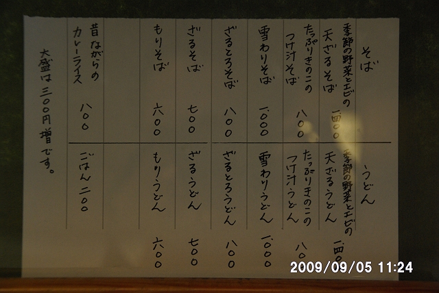 電車降りて、2軒目の手打ち蕎麦屋、「うちだ」のメニュー。