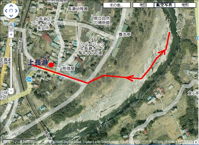 中央奥やや左、左へ曲流する部分に白い点に見えるのが虎岩か。