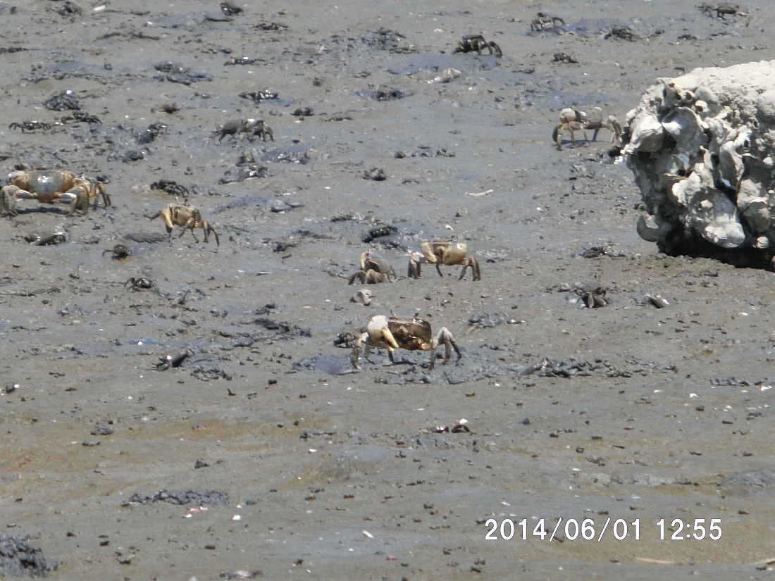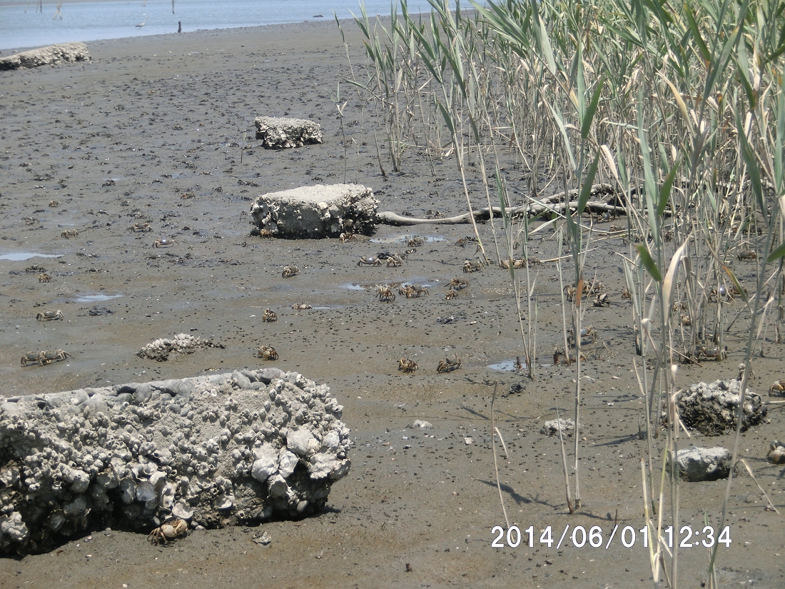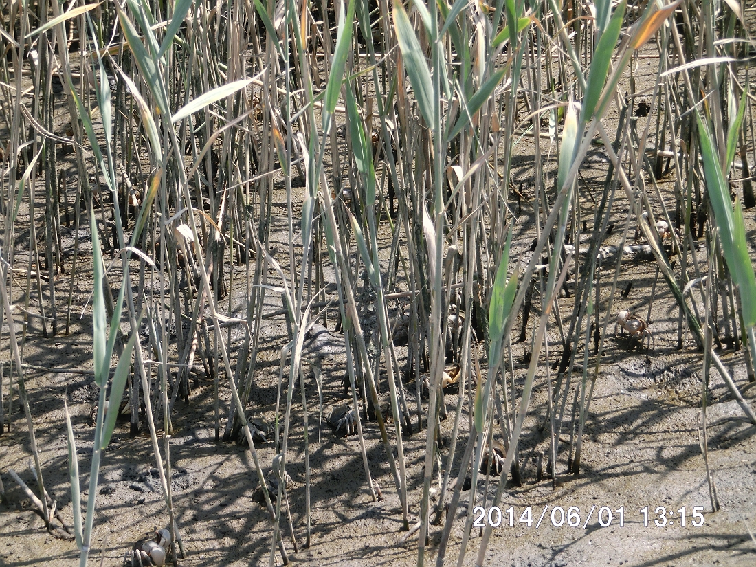 アシハラガニの群れが葦原近くに
