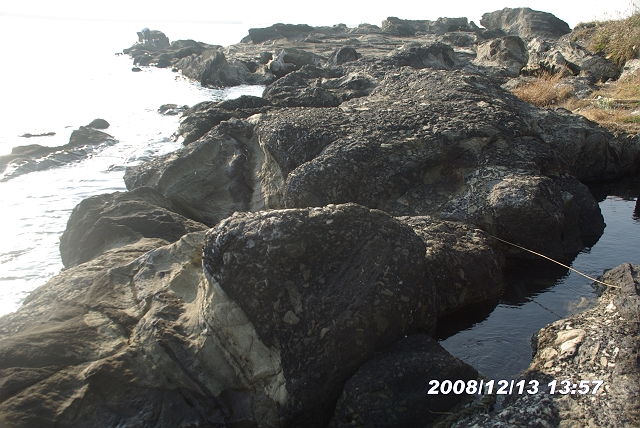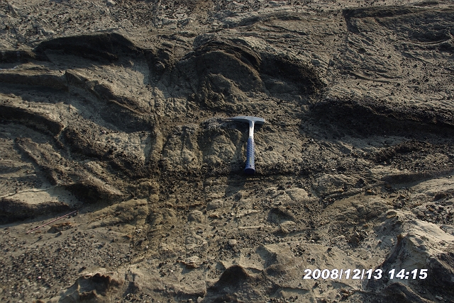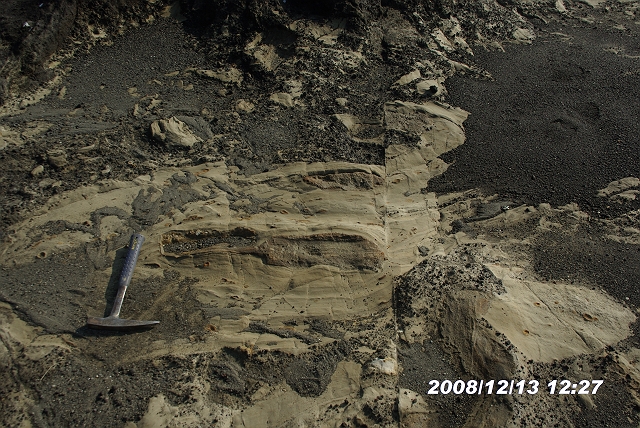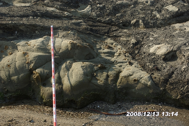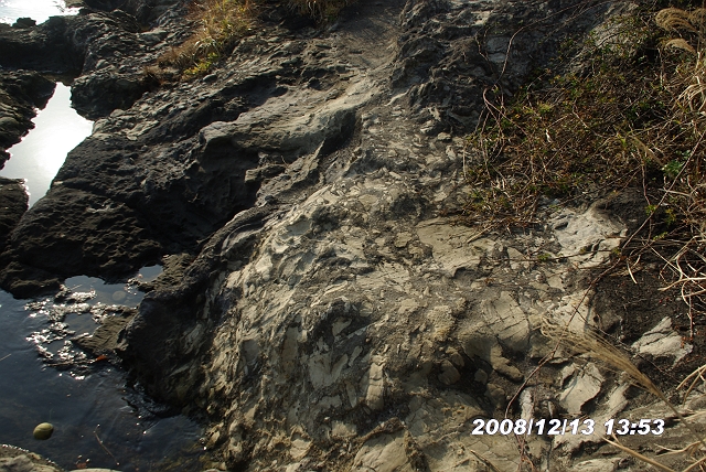 白っぽいのが混在岩、明るい部分はシルト岩