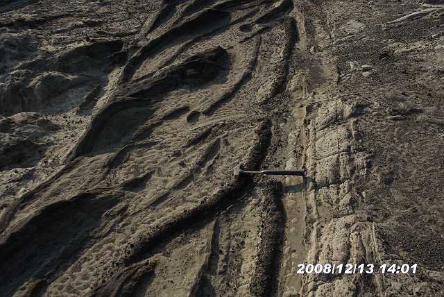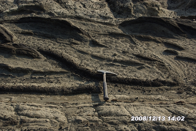 黒っぽい礫岩の中に縞目のシルト岩が混在
