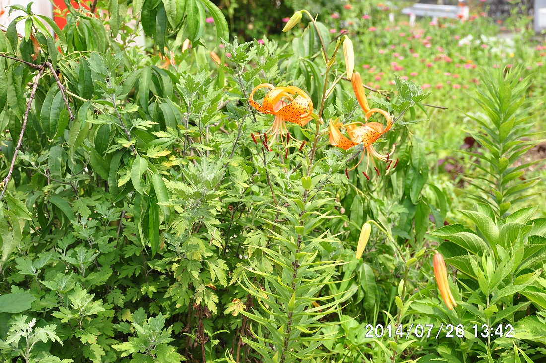 帰路途中のオニユリ、茎の葉の付け根にムカゴが付いている、植えたもの