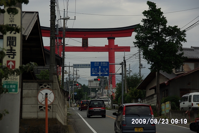 鳥居の右奥に雲を被った赤城山の一部が見える。