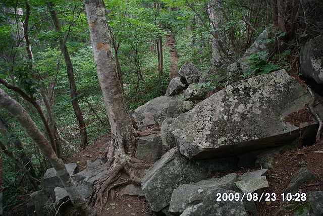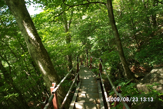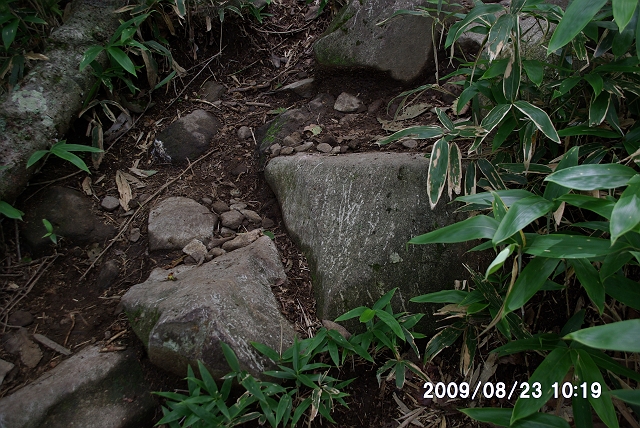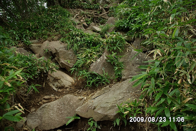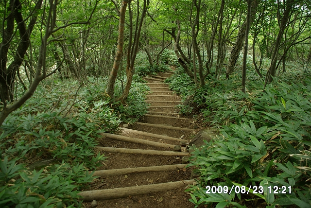 登山道は、ところどころに木の階段が、いくつかの形で設置されていた。