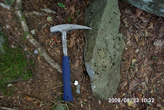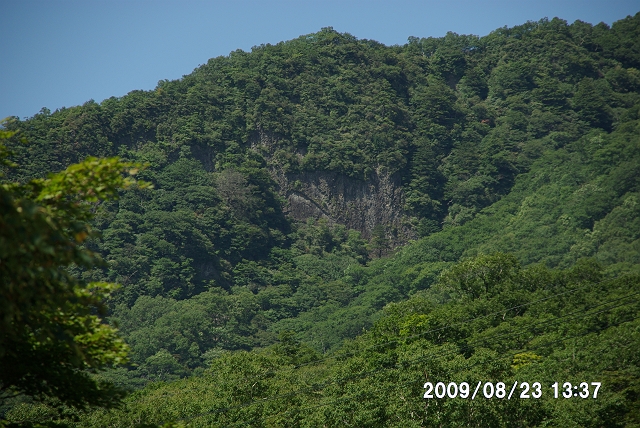 午前中に登った黒檜山の山腹に、厚い溶岩層(安山岩)が見えている。